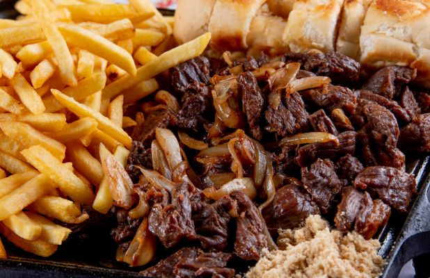 Porção de Filé Mignon Acebolado com Fritas no Big Dog Quintino, de R$74,90 por apenas R$51,90. Experimente Essa Delícia do Big Dog Lanches da Quintino!