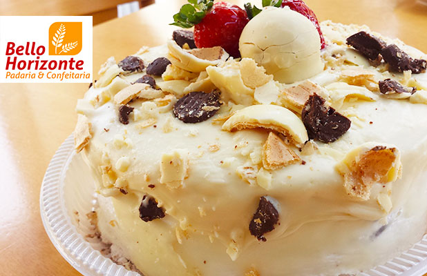 Bolo Sonho de Valsa ou Bolo Ouro Branco de 1,2 Kg com Trufa de Chocolate e Recheados de Pedaços de Bombom de R$51 por R$34 na Confeitaria Bello Horizonte. Irresistível!