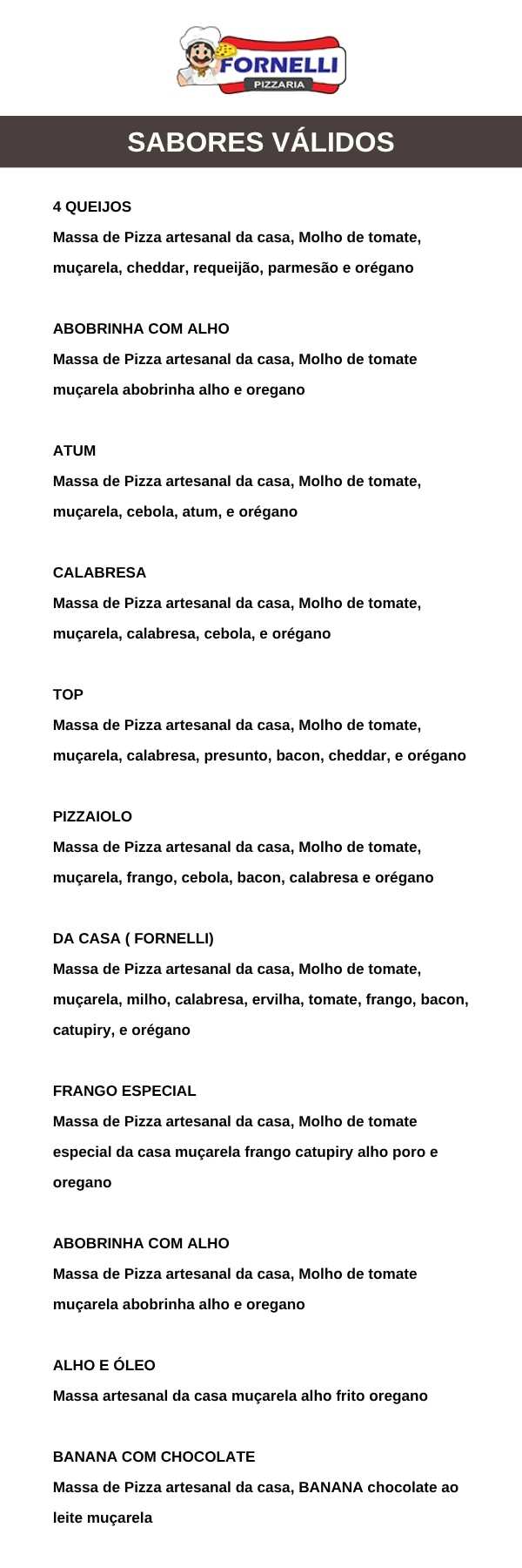 - Sabores: Atum, Quatro Queijos, Calabresa, Top, Pizzaiolo, Da Casa (Froenlli), Frango especial, Abóbrinha com Alho, Alho e Óleo e Banana