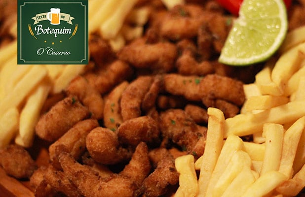Botequim Casarão: Combo Litoral com 1,8 kg p/ 4 pessoas com Camarão Empanado + Lula a Dorê + Cubos de Cação Empanado + Fritas, de R$69,90 por R$45,90. É toda Sexta-feira, aproveite essa oferta de estreia!
